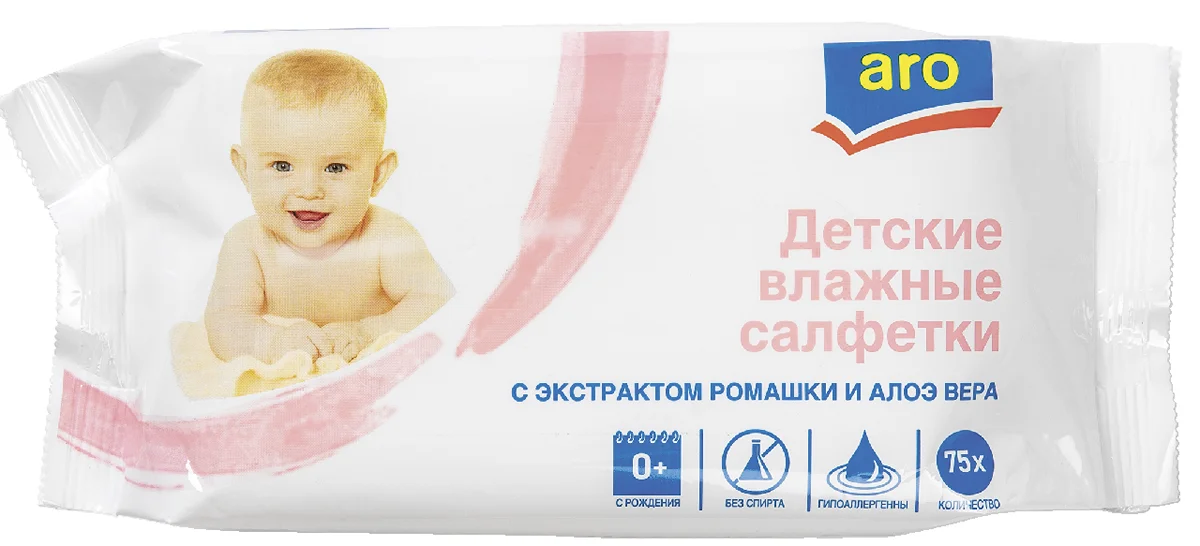 aro Салфетки влажные детские, 75шт созданы с учетом особенностей и потребностей нежной детской кожи. Их можно использовать в качестве уходового средства с первых дней жизни. Материал салфеток тонкий, прочный и приятный на ощупь. В нем отсутствуют мыло, спирт, фталаты, парабены, и красители. При использовании этих изделий риск появления аллергии сведен к минимуму (гипоаллергенная формула). Влажные салфетки можно использовать в любой ситуации, дома и на прогулке. Они не раздражают глазки, поэтому их можно применять без ограничений.