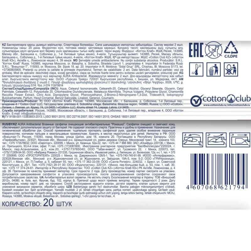 Салфетки влажные Aura Ромашка антибактериальные флоупак с мягким клапаном (20 листов в пачке)