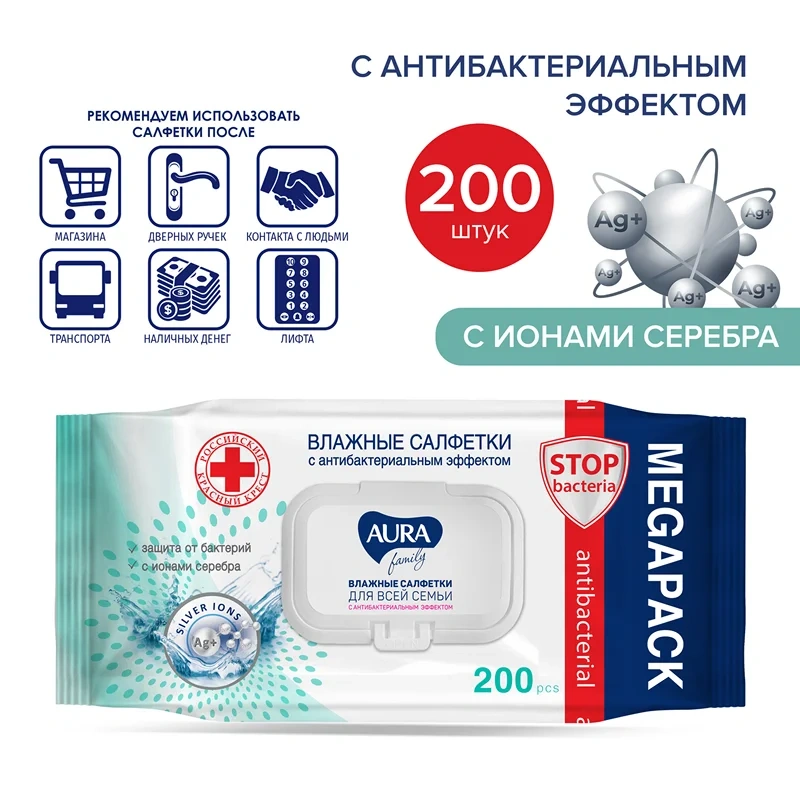 Салфетки влажные Aura Family для всей семьи с антибактериальным эффектом, 200 листов