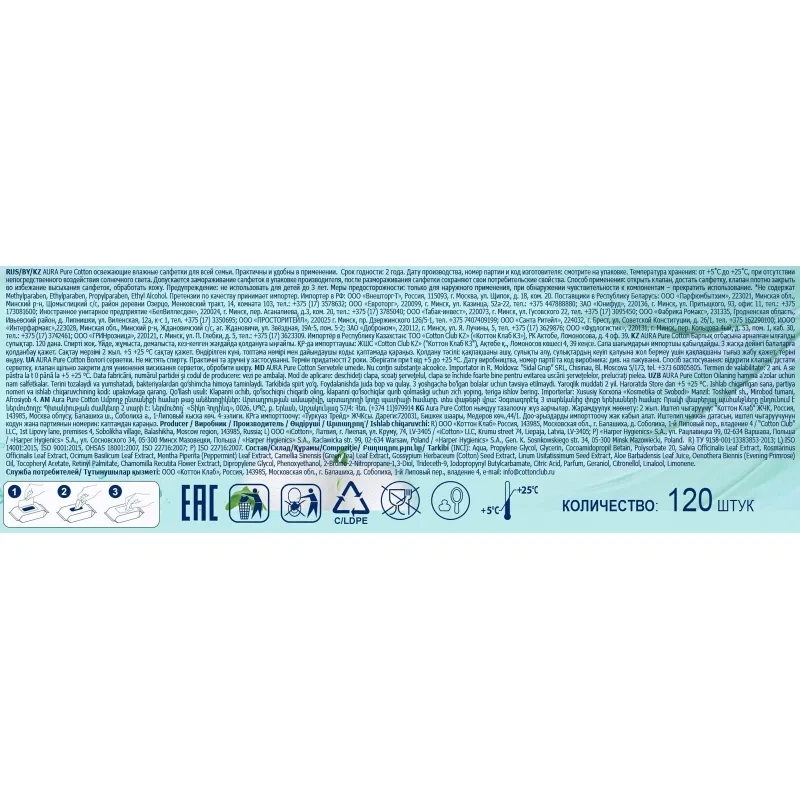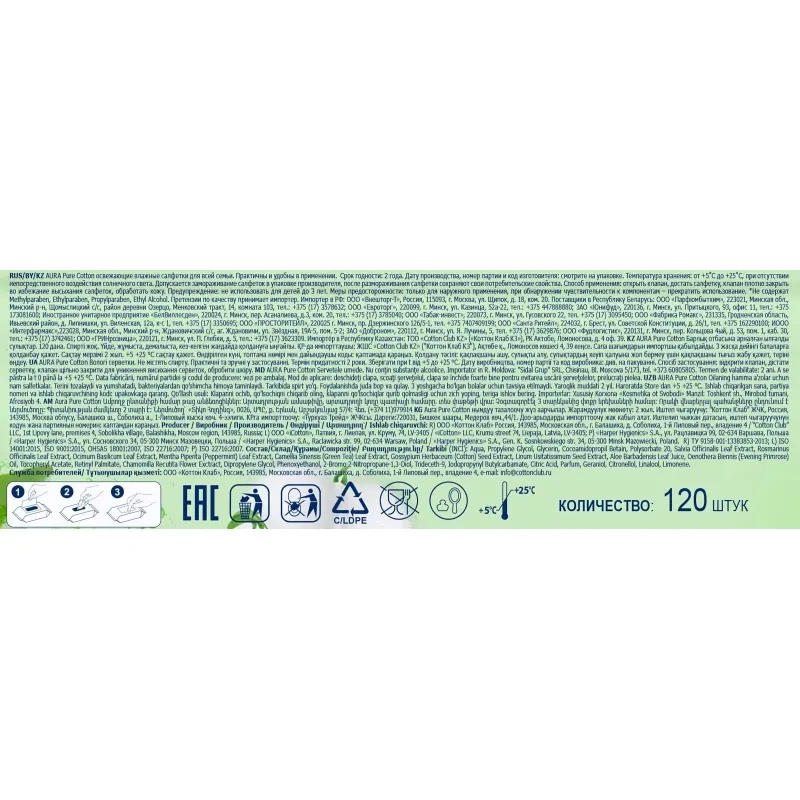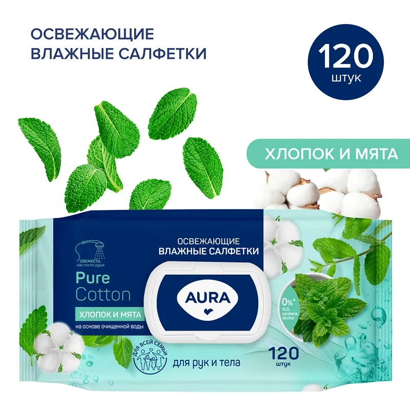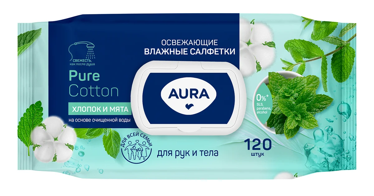 Салфетки влажные Aura освежающие флоупак с жёстким клапаном (120 листов в пачке)