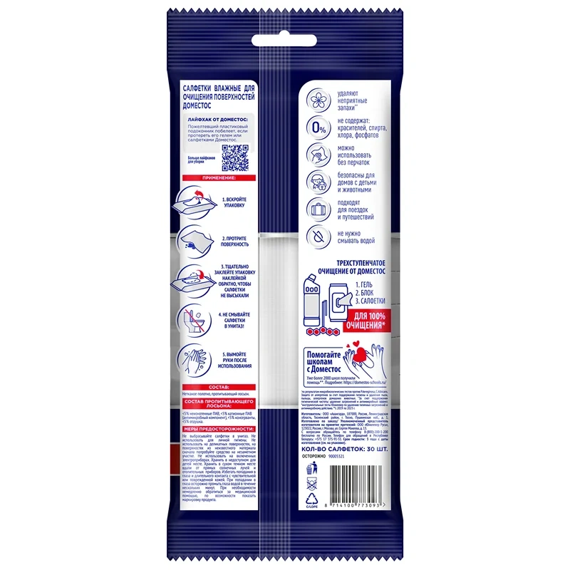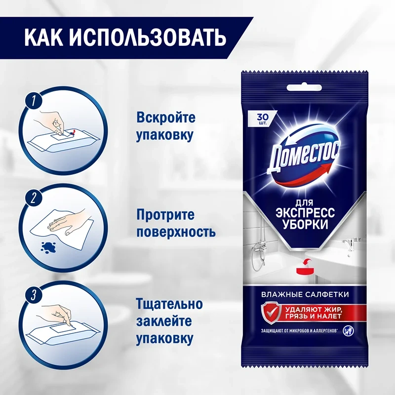 Универсальные влажные антибактериальные салфетки Доместос помогут отчистить грязь с различных поверхностей и обеспечить защиту от бактерий, размножения спор плесени или грибка. Влажные салфетки Доместос подходят для уборки всего дома и ухода за влагостойкими покрытиями. Влажные салфетки Доместос можно брать с собой для использования в общественных местах: в самолете и торговом центре, на вокзале и на прогулке, в кафе и офисе. После применения салфетки надолго оставляют аромат свежести и чистоты. Убивают вирусы, бактерии и помогают предотвратить размножение спор плесени или грибка. Они обладают мощной моющей формулой, которая обеспечивает глубокое очищение любых поверхностей и устранение неприятного запаха. Салфетки универсальные, поэтому подходят для уборки всего дома и дезинфекции влагостойких покрытий. Чистящее средство рекомендуется использовать на финальном этапе уборки: для полировки раковины, крана, ванной, зеркала или унитаза, а также для ежедневной санитарной обработки в период обострения вирусных инфекций. Салфетки не содержат агрессивных веществ, поэтому пользоваться ими можно без перчаток. Средство пропитано раствором бензалкония хлорида, известного своими антимикробными свойствами. Пользоваться продуктом достаточно просто: достаньте салфетку из упаковки и обработайте поверхность. Смывать водой не нужно! После уборки тщательно закройте упаковку, чтобы исключить высыхание ткани.