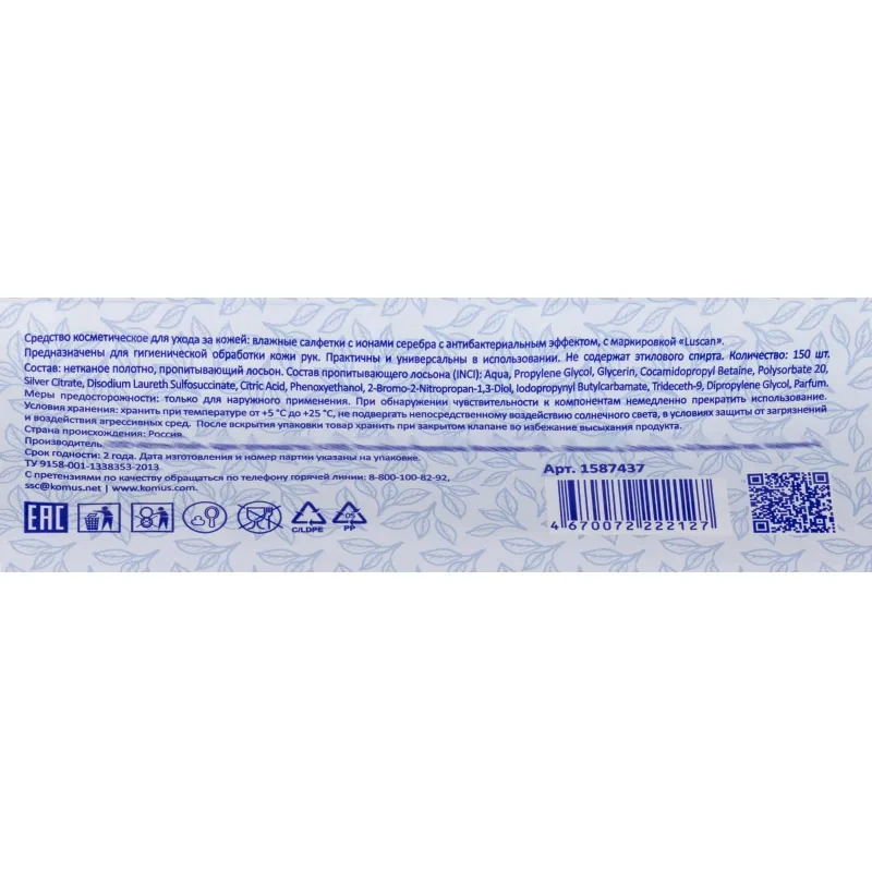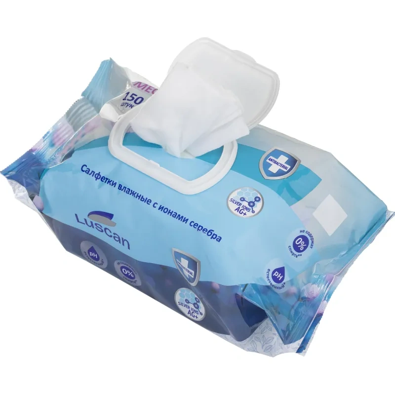 Салфетки влажные Luscan антибактериальные флоупак с жёстким клапаном (150 листов в пачке) Салфетки влажные Luscan с антибактериальным эффектом предназначены для гигиенической обработки кожи рук. Практичны и универсальны в использовании. Меры предосторожности: только для наружного применения. При обнаружении чувствительности к компонентам немедленно прекратить использование. Состав: нетканое полотно, пропитывающий лосьон (Aqua, Propylene Glycol, Glycerin, Cocamidopropyl Betaine, Polysorbate 20, Silver Citrate, Disodium Laureth Sulfosuccinate, Citric Acid, Phenoxyethanol, 2-Bromo-2-Nitropropan-1,3-Diol, Iodopropynyl Butylcarbamate, Trideceth-9, Dipropylene Glycol, Parfum).