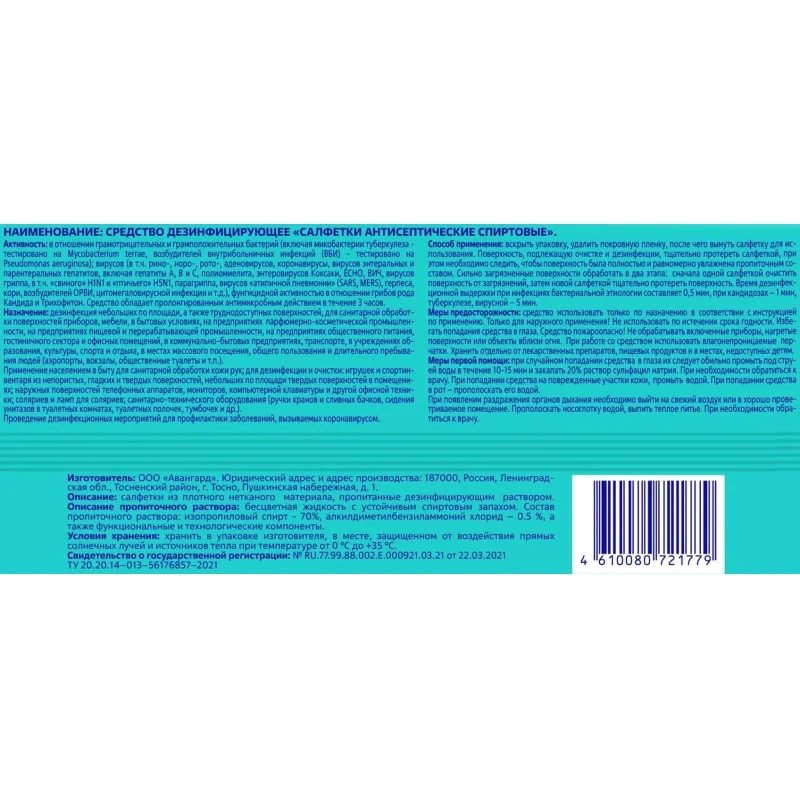Влажные антисептические салфетки Salfeti Antiseptic предназначены для предотвращения попадания микроорганизмов из внешней среды и их уничтожения. Обладают антимикробными действиями в отношении грамотрицательных и грамположительных бактерий (включая микобактерии туберкулёза — тестировано на Mycobacterium terrae, возбудителей внутрибольничных инфекций (ВБИ) — тестировано на Pseudomonas aeruginosa). возбудителей острых респираторных заболеваний, бактериальных кишечных инфекций, грибковых заболеваний. Салфетки пропитаны 70% спиртовым раствором, что позволяет обеззараживать поверхности за 5–10 мин.