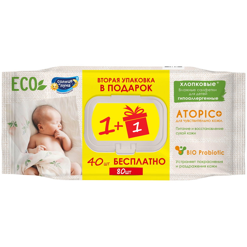 Салфетки влажные Солнце и луна 'Eco. Atopic', детские, 40шт+ПРОМО