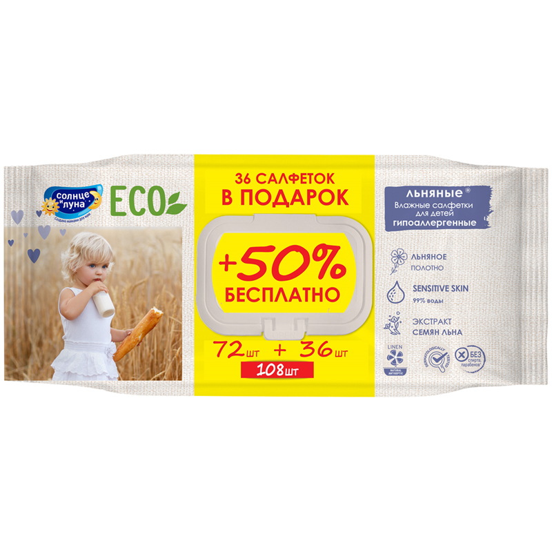 Салфетки влажные Солнце и луна 'EСО', детские 0+, льняные, 72 шт+50% в подарок