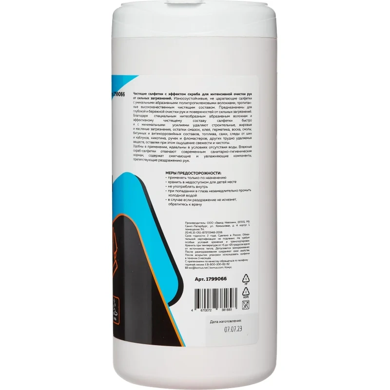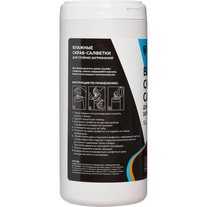 Чистящие салфетки с эффектом скраба для интенсивной очистки рук от сильных загрязнений. Износоустойчивые салфетки с уникальными абразивными полипропиленовыми волокнами, пропитанные высококачественным чистящим составом. Предназначены для глубокой и бережной очистки рук, поверхностей от сильных загрязнений. Благодаря специальным нитеобразным абразивным волокнам и эффективному чистящему составу салфетки быстро и с минимальными усилиями удаляют: строительные, жировые, масляные загрязнения; остатки смазок, клея, герметика, воска, смолы, битумных и антикоррозийных составов, топлива, сажи, следы от шин и каблуков, никотина, ручек и фломастеров, других трудно удаляемых веществ, оставляя при этом ощущение свежести и чистоты. Удобны в применении, идеальны в условиях отсутствия воды. Отвечают современным санитарно-гигиеническим нормам, содержат смягчающие и увлажняющие компоненты, препятствующие раздражению рук.