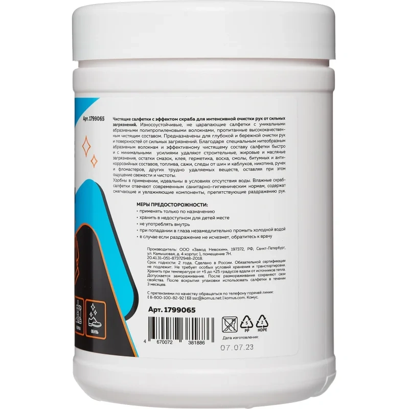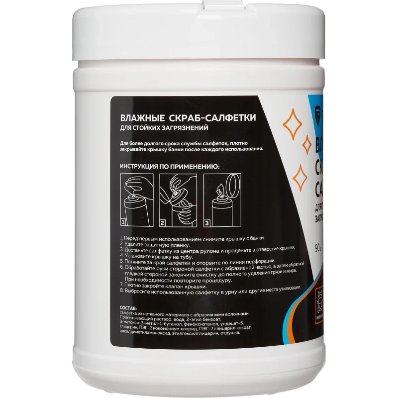Чистящие салфетки с эффектом скраба для интенсивной очистки рук от сильных загрязнений. Износоустойчивые салфетки с уникальными абразивными полипропиленовыми волокнами, пропитанные высококачественным чистящим составом. Предназначены для глубокой и бережной очистки рук, поверхностей от сильных загрязнений. Благодаря специальным нитеобразным абразивным волокнам и эффективному чистящему составу салфетки быстро и с минимальными усилиями удаляют: строительные, жировые, масляные загрязнения; остатки смазок, клея, герметика, воска, смолы, битумных и антикоррозийных составов, топлива, сажи, следы от шин и каблуков, никотина, ручек и фломастеров, других трудно удаляемых веществ, оставляя при этом ощущение свежести и чистоты. Удобны в применении, идеальны в условиях отсутствия воды. Отвечают современным санитарно-гигиеническим нормам, содержат смягчающие и увлажняющие компоненты, препятствующие раздражению рук.