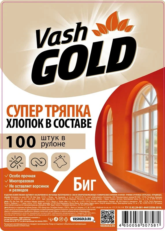 Тряпка Vash Gold Big в рулоне размером 14,5 х 28,5 х 14,5 см включает 100 листов, изготовленных из н...