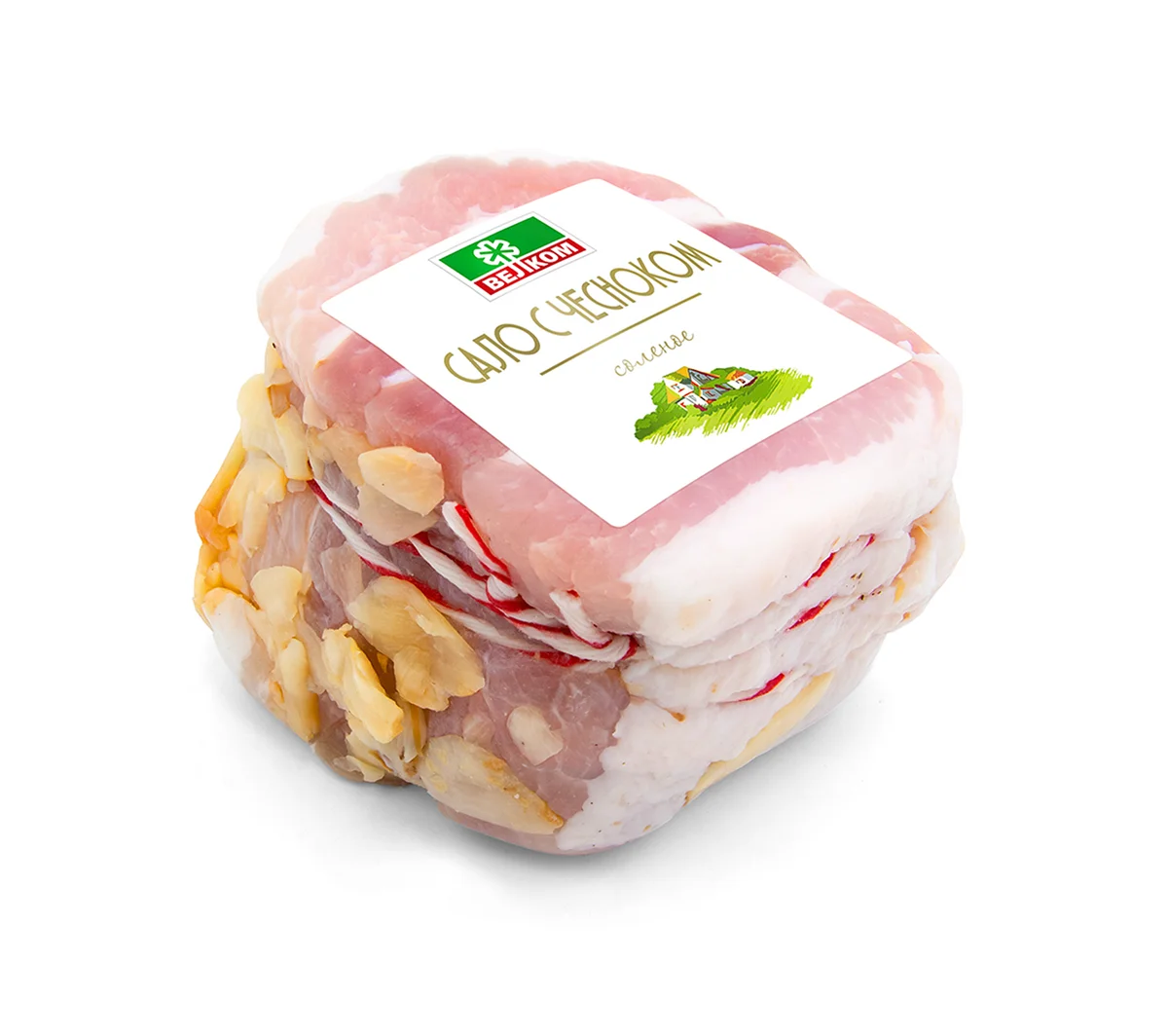 Сало Велком с чесноком — традиционное свиное сало с небольшой прослойкой мяса и ароматными приправами. Продукт обладает насыщенным ароматом и нежным, сбалансированным в отношении соли и специй вкусом. Прекрасно подойдет в качестве дополнения к различным первым или вторым блюдам ли их ингредиента. Подается нарезанным тонкими ломтиками, разложенными на тарелке с зеленью или картофелем.