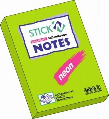 Самоклеящийся блок для записей, выполнен в неоновом зеленом цвете. Количество листов: 100 листов
