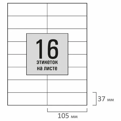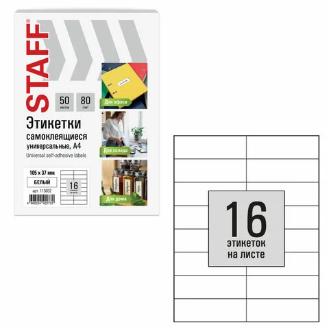 Этикетка самоклеящаяся 105х37мм, 16 этикеток, белая, 80г/м2, 50 листов, STAFF BASIC, 115652