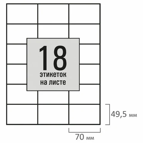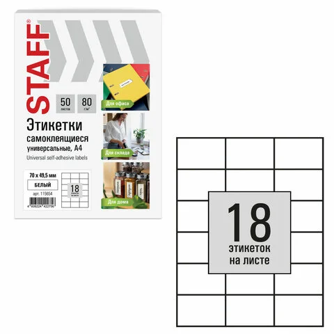 Этикетка самоклеящаяся 70х49,5мм, 18 этикеток, белая, 80г/м2, 50 листов, STAFF BASIC, 115654