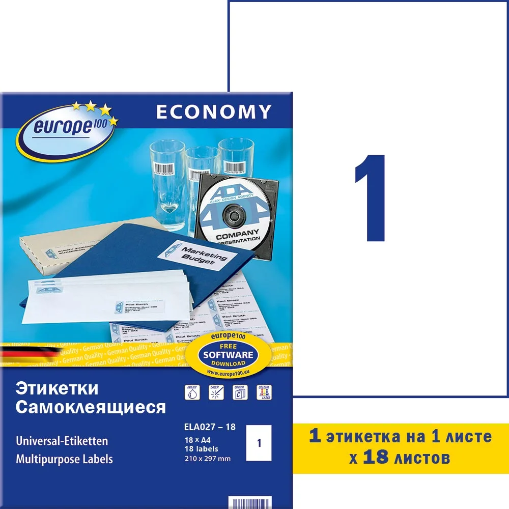 Этикетки самоклеящиеся Avery Zweckform Europe100 ELA027, белые, 210х297мм, 1шт на листе А4, 18 листов
