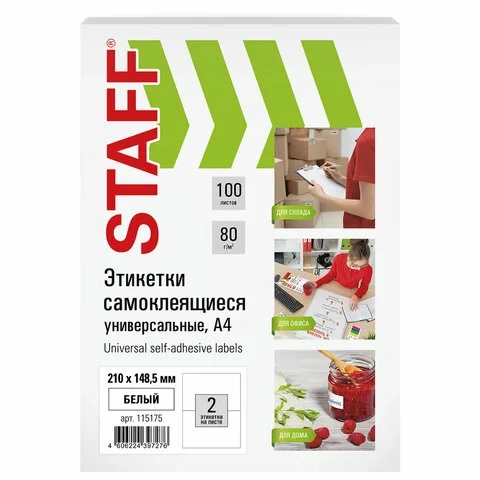 Этикетка самоклеящаяся 105х148,5мм, 4 этикетки, белая, 80г/м2, 50 листов, STAFF BASIC, 115644