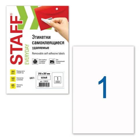 Этикетки удаляемые Staff белые, 210х297мм, 1шт на листе А4, 50 листов