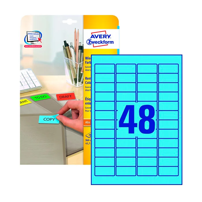 Этикетки удаляемые Avery Zweckform L6039-20, голубые, 45.7x21.2мм, 48шт на листе А4, 20 листов