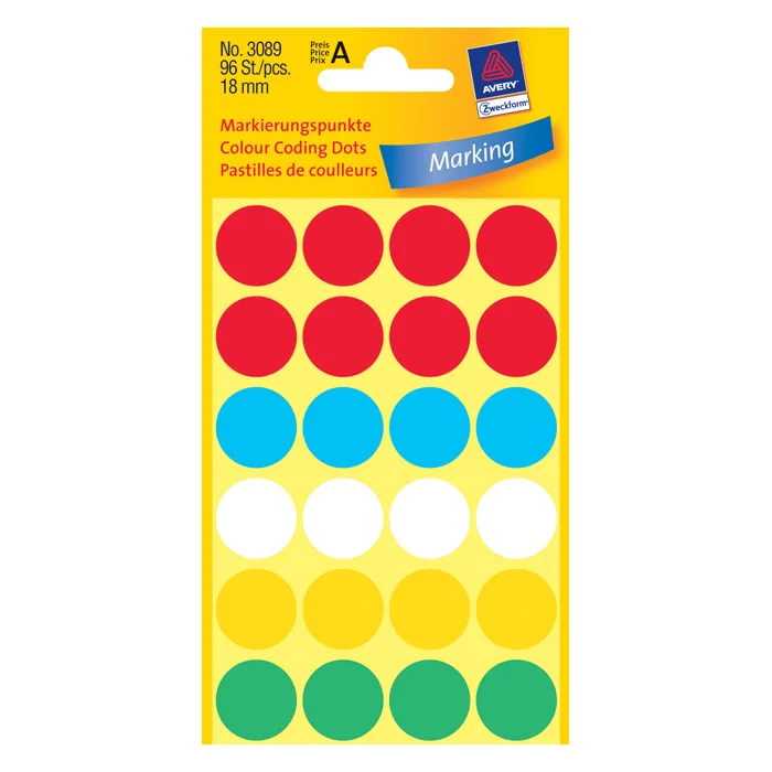 Этикетки маркеры Avery Zweckform 3089, разноцветные, d=18мм, 24шт на листе, 4 листа