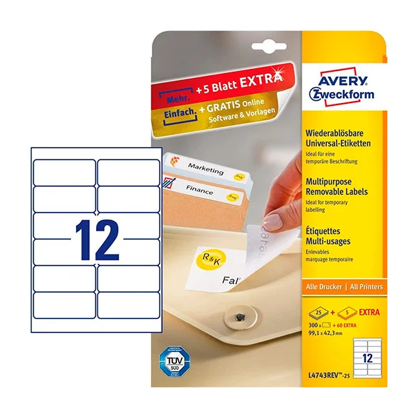 Этикетки удаляемые Avery Zweckform L4743REV-25, белые, 99.1х42.3мм, 12шт на листе А4, 30 листов