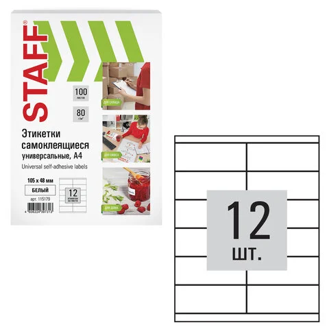 Этикетка самоклеящаяся 105х48мм, 12 этикеток, белая, 80г/м2, 50 листов, STAFF BASIC, 115648