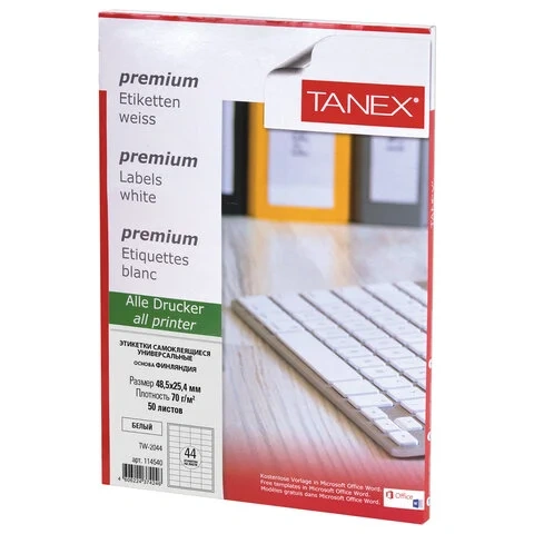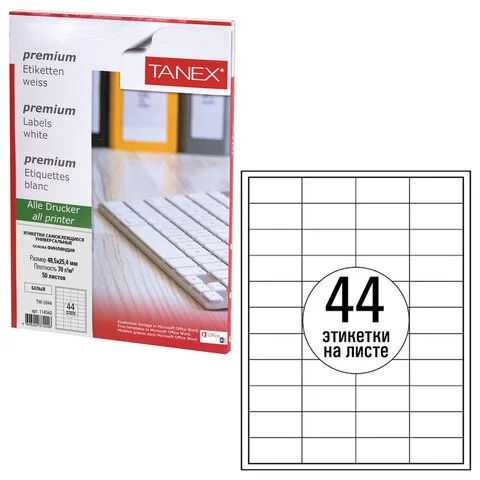 Этикетка самоклеящаяся 48,5х25,4 мм, 44 этикетки, белая, 70 г/м2, 50 листов, TANEX, сырье Финляндия,