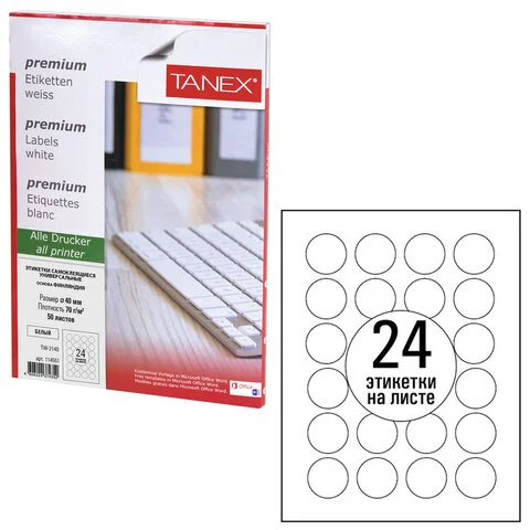 Этикетка самоклеящаяся D40 мм, 24 этикетки, белая, 70 г/м2, 50 листов, TANEX, сырье Финляндия, 11455