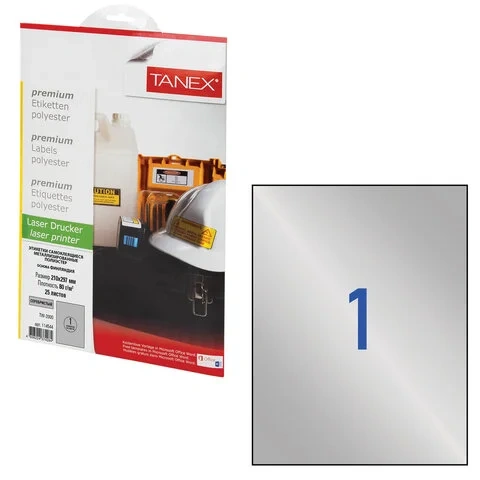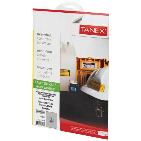 Этикетка самоклеящаяся 210х297 мм, 1 этикетка, полиэстер, серебро, 25 листов, TANEX, сырье Финляндия