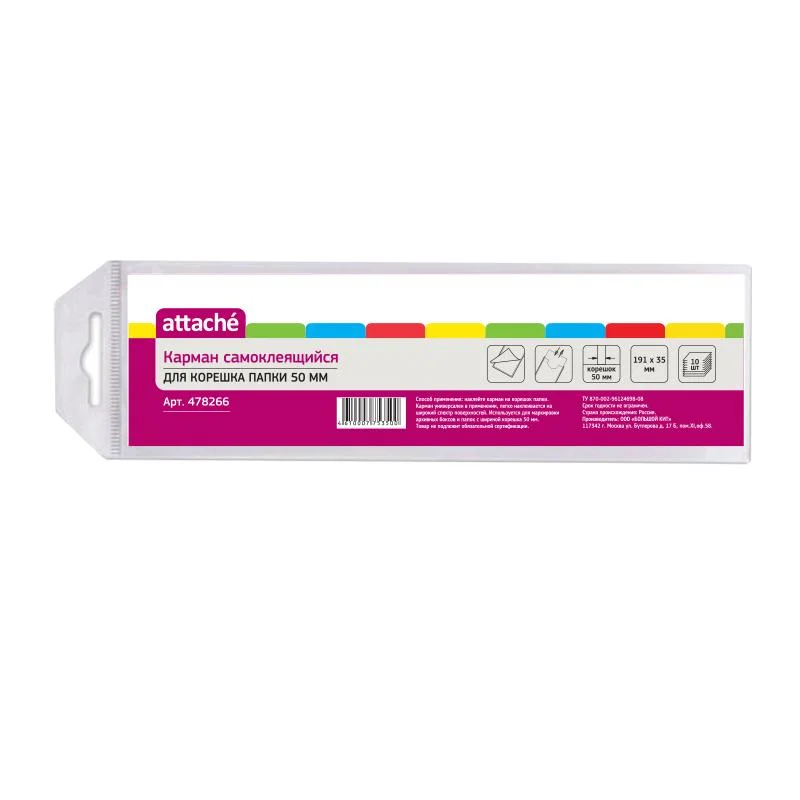 Самоклеящиеся прозрачные карманы Attache выполнены из ПВХ, размер — 191×35 мм. Предназначены для маркировки архивных папок. Оптимальны для папок с шириной корешка 50 мм, с ровной гладкой поверхностью. Нижний лист кармана белого непрозрачного цвета, наружный лист кармана — прозрачный. Также могут крепиться с внешней и с внутренней стороны обложки. В упаковке 10 карманов.