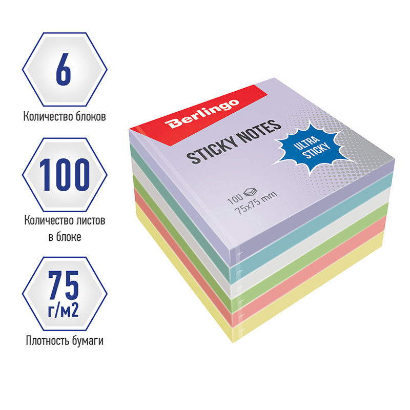 Самоклеящийся блок Berlingo 'Ultra Sticky', 75*75мм, 6*100 листов, 5 пастельных цветов + 1 белый