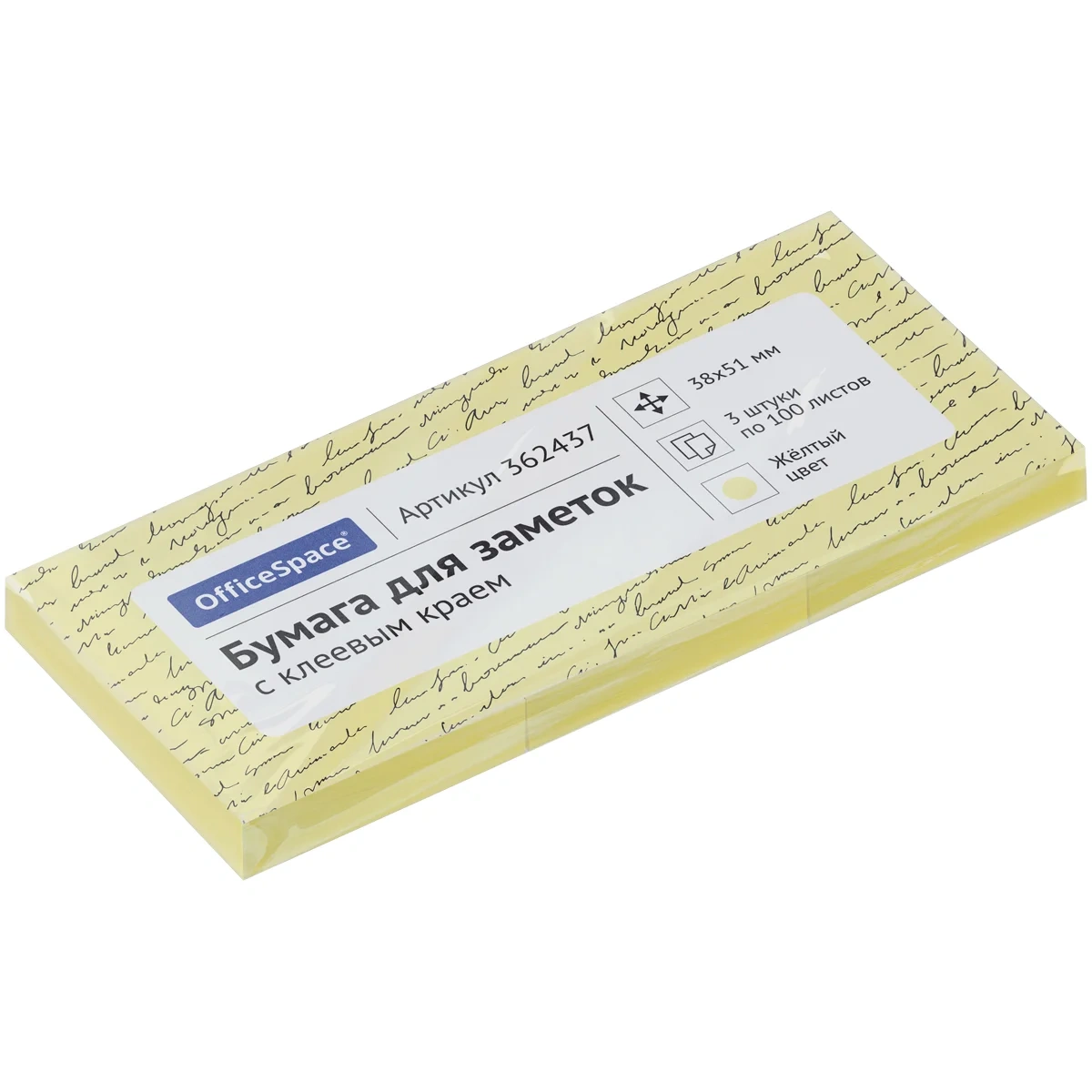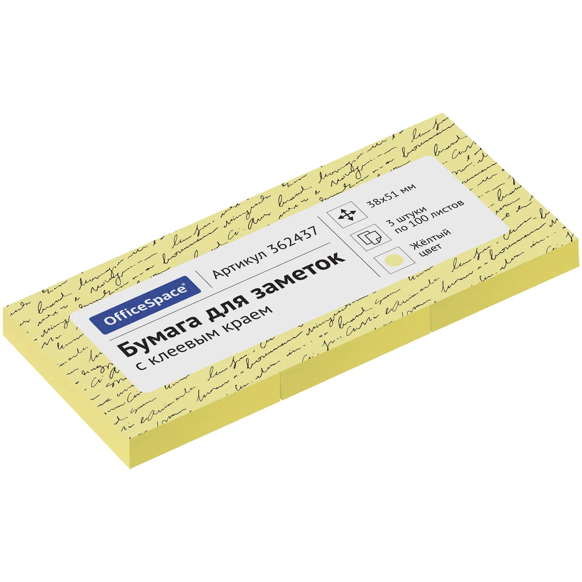 Самоклеящийся блок OfficeSpace, 38*51мм, 3 блока по 100л., желтый