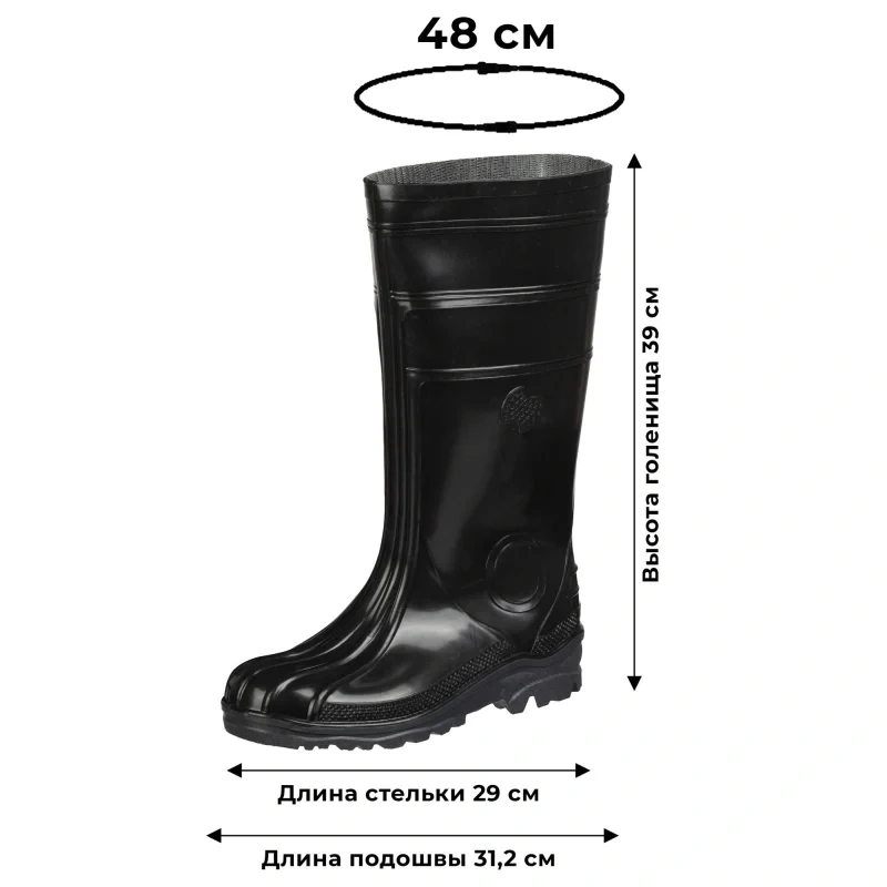 Сапоги мужские цв.черный мод. 155 (р.44) ПВХ с мет. подноском Сапоги рабочие мужские модели М-155 выполнены в черном цвете. Соответствуют размеру 44. Материал верха и подошвы сделаны из ПВХ. Внутренний защитный металлический подносок эффективно защищает от химических факторов (воды, нефти, нефтепродуктов, растворов кислот концентрацией до 80% (К80) и щелочей, концентрацией до 50% (Щ50), общих производственных загрязнений и механических воздействий (от ударов в носочной части энергией 200 Дж). Цельнолитой метод крепления подошвы к верху. Стелька из искусственного войлока. Срок хранения: 12 месяцев со дня покупки при соблюдении правил эксплуатации. Гарантийный срок эксплуатации: 90 дней. Данная модель предназначена для защиты от общих производственных загрязнений, от кислот и щелочей, от механических повреждений. Соответсвуют стандартам ГОСТ 12.4.072-79, ГОСТ 12.4.177-89, ГОСТ 5375-79, ТР ТС 019/2011. Цвет на изображении товара в интернет-магазине или в печатном каталоге может отличаться от оригинала из-за особенностей цветопередачи монитора.