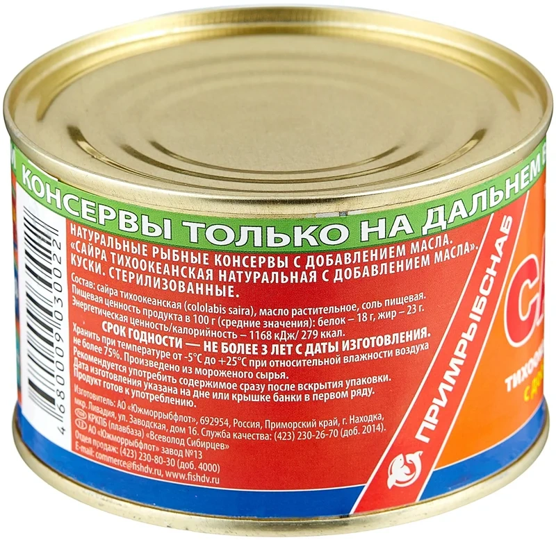 Сайра Примрыбснаб тихоокеанская натуральная с добавлением масла натуральная, 250г