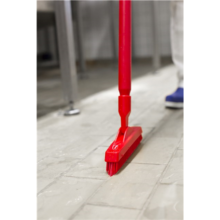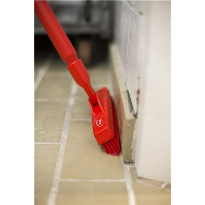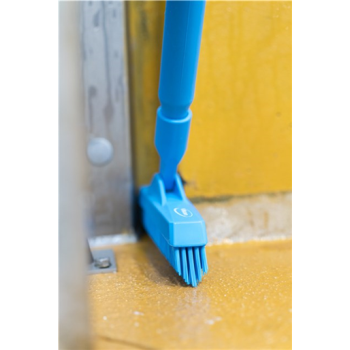 Скраб-щетка для чистки щелей идеально подходит для чистки труднодоступных мест под и между оборудованием, так как ручка может быть расположена параллельно полу. Щетинки расположены в форме стрелки, которая обеспечивает очень эффективную очистку даже в случае небольших трещин и щелей. Средний ряд щетинок - более жесткий, что обеспечивает эффективную очистку.