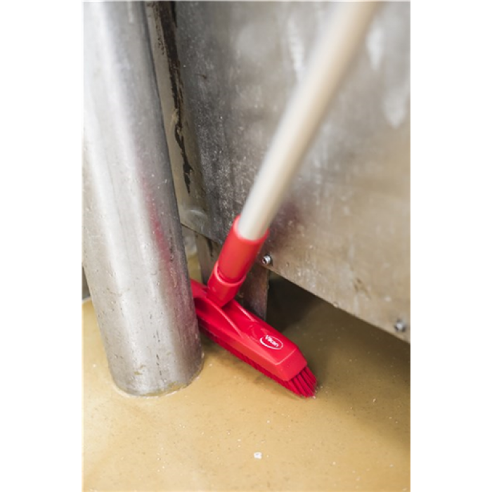 Скраб-щетка для чистки щелей идеально подходит для чистки труднодоступных мест под и между оборудованием, так как ручка может быть расположена параллельно полу. Щетинки расположены в форме стрелки, которая обеспечивает очень эффективную очистку даже в случае небольших трещин и щелей. Средний ряд щетинок - более жесткий, что обеспечивает эффективную очистку.