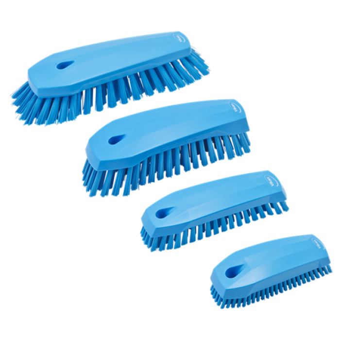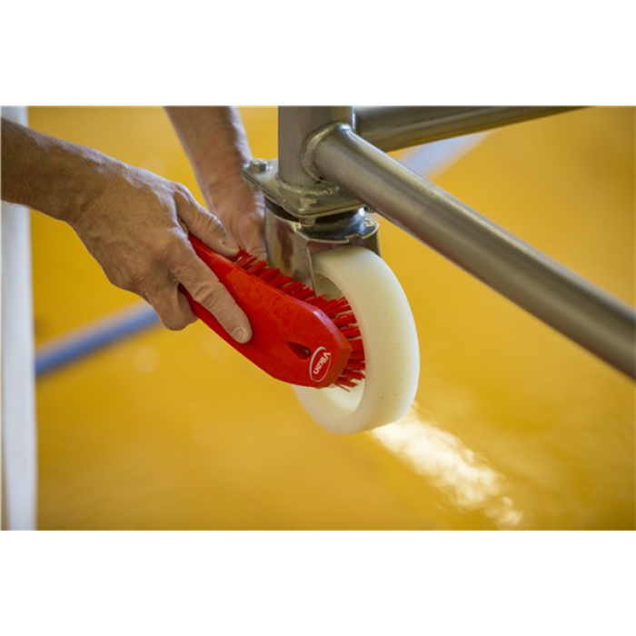 Универсальная щетка с ворсом, расположенным под углом, предназначена для чистки столов, конвейерных лент, разделочных досок, ведер, больших мерных ковшей и оборудования, где необходима очистка в углах. С одной стороны щетки ворс более жесткий,что позволяет удалять самые сильные загрязнения.