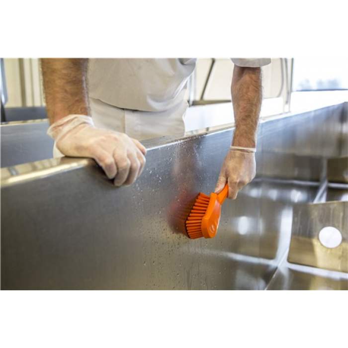 Эта щетка является своеобразной 'pабочей лошадкой' в линейке. Удобная ручка дает возможность работать долго, не уставая. Жесткость ворса обеспечивает необходимый чистящий эффект. Подходит для ручной мойки любого оборудования, столов и стен. Можно держать за ручку или за колодку.