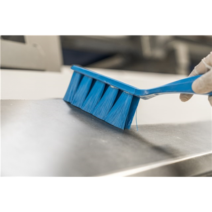 Щетка с мягким ворсом повышенной прочности ULTRA SAFE TECHNOLOGY. Эта щетка идеально подходит для удаления сухого мелкого мусора с нвейерных лент, поверхностей для подготовки продуктов, столов и другого оборудования, где высок риск загрязнения. Расположение ворса повышенной прочности обеспечивает эффективное удаление сухого мелкого мусора.