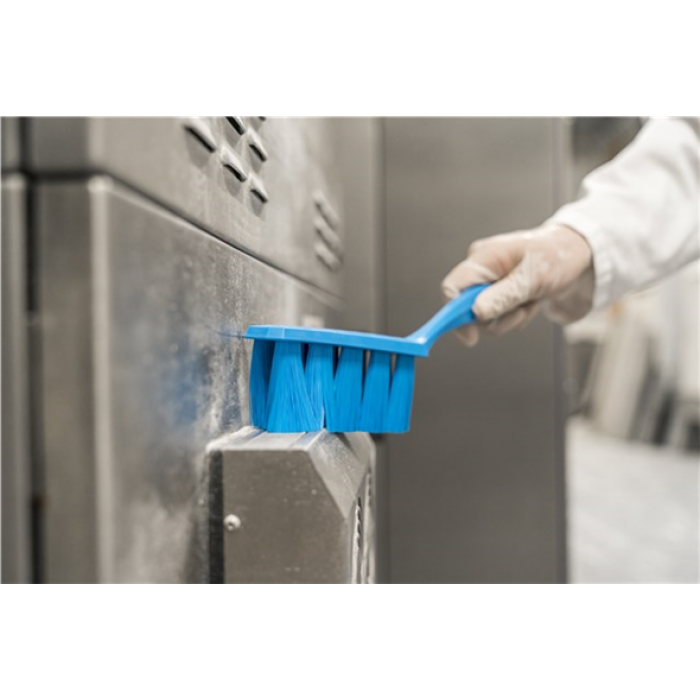 Щетка с мягким ворсом повышенной прочности ULTRA SAFE TECHNOLOGY. Эта щетка идеально подходит для удаления сухого мелкого мусора с нвейерных лент, поверхностей для подготовки продуктов, столов и другого оборудования, где высок риск загрязнения. Расположение ворса повышенной прочности обеспечивает эффективное удаление сухого мелкого мусора.