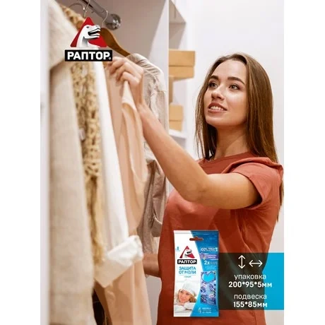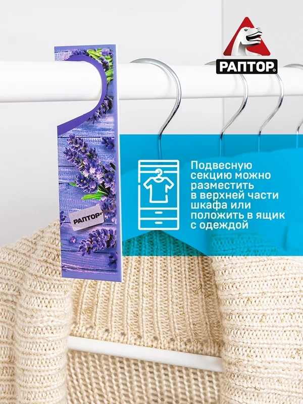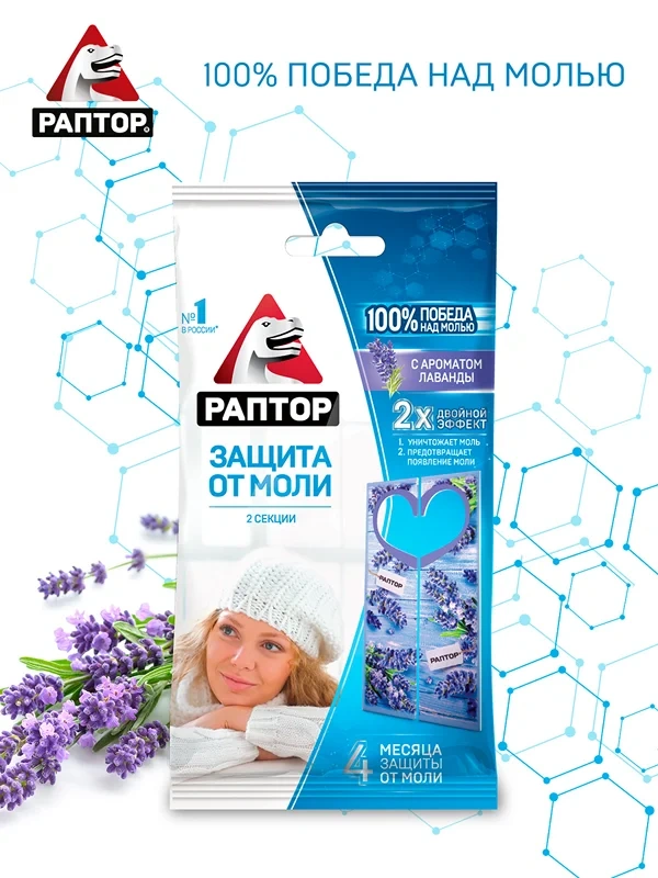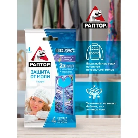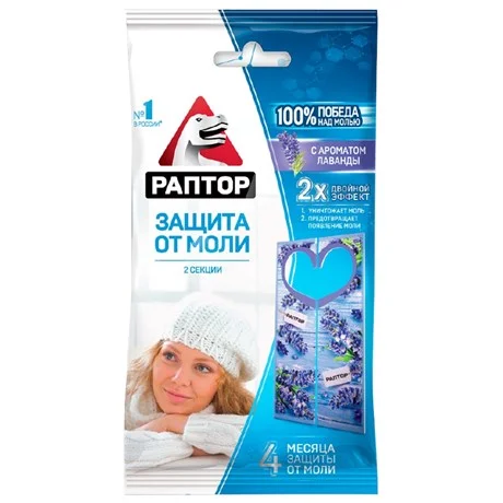 Средство от насекомых Раптор с ароматом лаванды бумажные подвески (2 штуки в упаковке). Назначение: Быстро, просто, эффективно и недорого? Это к нам! Представляем самое покупаемое средство от моли РАПТОР в максимально простом и супер-эффективном формате - картонная подвеска с ароматом лаванды. В состав формулы 'ДВОЙНОЙ ЭФФЕКТ' входит современное быстродействующее вещество - трансфлутрин. Благодаря высокой летучести и проникающей способности, оно поражает насекомых в 10 раз быстрее, чем любое другое вещество этого класса. А масло лаванды отпугивает взрослых особей, нарушая их репродуктивный цикл, что препятствует появлению новых личинок моли. Все что вам нужно - это разделить секцию на две части по линии перфорации и повесить ее в шкафу, гардеробной комнате или поместить в ящики с одеждой (из расчета одна секция на 0,5 куб. м). РАПТОР гарантирует до 4-х месяцев эффективной защиты ваших вещей от моли! Раптор-эффект: понасекомых нет! Секрет популярности секции от моли РАПТОР с запахом лаванды: - Формула 'ДВОЙНОЙ ЭФФЕКТ' : активное вещество ликвидирует моль, аромат лаванды отпугивает новых особей, препятствуя их повторному появлению; - В состав формулы входит современное быстродействующее вещество transfluthrin (трансфлутрин); - Не оставляет пятен и следов на одежде; - До 4-х месяцев эффективной защиты; -Приятный аромат лаванды. Способ применения: Достаньте секцию из упаковки, повесьте в верхней части шкафа или разместите в ящиках с одеждой (из расчета 2 секции на 0,5 м). Действует в течение 4 месяцев с момента вскрытия упаковки. Меры предосторожности: Избегать контакта средства с кожей и слизистой оболочкой глаз. После размещения средства вымыть руки водой с мылом. Хранить отдельно от пищевых продуктов в местах, недоступных для детей и домашних животных. Состав: трансфлутрин - 34 мг на пластину, ароматизаторы, картонная основа. Условия хранения: от минус 20 до плюс 30. Срок годности: 60 месяцев.