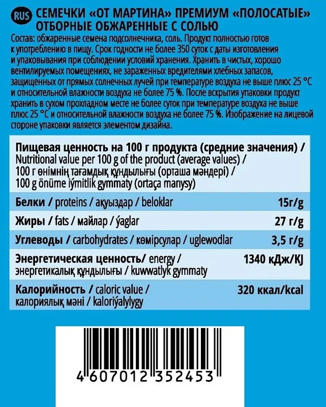 Семечки полосатые с солью отборные От МАРТИНА, 150 г скрасят любой вечер за посиделкам или душевными разговорами. Этот вкусный и полезный продукт любят как взрослые, так и дети. Семена подсолнечника содержат большое количество витамина D, которого здесь больше даже, чем в печени трески. Входящие в состав аминокислоты способствуют улучшению кожи и слизистых оболочек, нормализуют кислотно-щелочной баланс, стабилизируют работу сердечно-сосудистой системы. Семечки могут замедлить процесс старения и снизить холестерин в крови, а цинк, который также есть в этом продукте, отвечает за блестящие и красивые волосы. Прочная оболочка семечек надежно защищает содержимое от повреждения и позволяет сохранить все полезные свойства зерен. Однако не стоит употреблять в пищу слишком много жареных семечек, ведь они достаточно калорийны. Поэтому, если вы придерживаетесь диеты, есть этот снек в неограниченном количестве нежелательно, а вот умеренное потребление будет способствовать насыщению организма полезными веществами и снятию нервного напряжения. Компания «МАРТИН» была основана в 2000 г. 18 лет работы над улучшением селекции, технологии обжарки и условий хранения не прошли даром – сейчас компания «МАРТИН» предлагает самые лучшие отборные семечки, которые хорошо известны не только в России, но и за рубежом. Выбор сорта подсолнечника и места выращивания играет важную роль для достижения желаемого результата. Новейшая техника и высочайшая квалификация специалистов – вот две основные составляющие успеха этой торговой марки! «МАРТИН» постоянно анализирует современные технологии и использует их при производстве своей продукции, что позволяет ТМ внедрять инновационные решения. Семечки компании «МАРТИН» отличаются великолепным качеством и неповторимым вкусом. Пищевая ценность на 100 г: белки 20,7 г, жиры 52,9 г, углеводы 5 г. Калорийность: 578 ккал.Состав: семена подсолнечника жареные, соль. Бренд: От МАРТИНА.Производитель: Мартин.Страна: Россия.Вид: подсолнечные.Вид семян подсолнуха: полосатые.Обработка: жареные.Очистка: неочищенные.Добавки: соль. Вес: 150 г.Условия хранения: при температуре от 0°С до +25° в сухом прохладном месте и относительной влажности воздуха не более 75%.Срок хранения: 8 мес.Вид упаковки: пластиковый пакет.Особенности упаковки: флоу-пак.