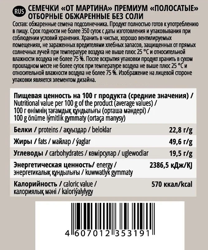 Семечки Отборные Полосатые с солью От Мартина, 150г – вкусный продукт, которые очень популярен как среди взрослых, так и среди детей. С ним можно скрасить свой досуг или отвлечься во время рабочего перерыва. В семенах подсолнечника содержится большой спектр веществ, необходимых организму человека. Это не только белки, жиры и углеводы, но и различные витамины. Среди них есть такие, как А (важен для зрения), B (полезен для кожи, волос, нервной системы), E (сильный антиоксидант) и некоторые другие. Также в семенах подсолнечника содержатся магний, кальций, калий, цинк, селен и ряд других макро- и микроэлементов. Незаменимые аминокислоты нормализуют жировой обмена, а ненасыщенные жирные кислоты положительно влияют на работы кровеносной и сердечно-сосудистой систем. Продукт поставляется в практичной и герметичной упаковке, которая надежно защищает содержимое от внешнего воздействия.Компания «Мартин», которая является производителем данной продукции, была основана в 2000 году в Московской области. За все годы своего существования она вложила немало сил в улучшении селекции, технологии обжарки и создании необходимых условий для хранения готовой продукции. Благодаря этому компания предлагает потребителям отборные семечки, которые известны не только в РФ, но и некоторых других странах. Сегодня «Мартин» предлагает свыше ста наименований продукции, для изготовления которой используются только экологичные компоненты. Высокие результаты работы компании были неоднократно отмечены различными наградами. В частности, высокое качество продукции было подтверждено призами на таких международных выставках, как «Зеленая неделя», «Продэкспо», WorldFood и ArmProd Expo. Пищевая ценность на 100 г: белки - 20,7 г, жиры - 52,9 г, углеводы - 5 г. Калорийность на 100 граммов: 578 ккал. Тип продукта: семечки. Вид: подсолнечные. Обработка: жареные. Очистка: неочищенные. Вкус: соленые. Условия хранения: при температуре не выше +25°C и относительной влажности воздуха не более 75% срок хранения: 11 мес.
