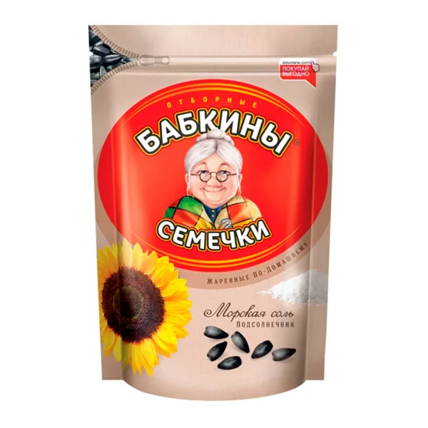 Бабкины семечки с солью – питательное, равномерно обжаренное и в меру пикантное лакомство. Его можно употреблять с разными напитками или как самостоятельный продукт. Это бюджетная закуска подходит для просмотра фильма или сериала вместе с родными. Ядра отборных подсолнухов не содержат отдушек, красителей и консервантов, полностью готовы к употреблению. Составляющие одинакового размера обладают характерным насыщенным маслянисто-ореховым вкусом, являются абсолютно натуральными, свежими и качественными. Бабкины семечки С солью в меру калорийные, содержат много полезных витаминов, минералов, углеводы и белки. Употребление продукта положительно сказывается на внешности, иммунитете и сердечно-сосудистой системе. Упаковка семечек оснащена удобным зип-локом, который можно закрыть одним движением. В таком пакете продукт удобно брать с собой в дорогу или прогулку.