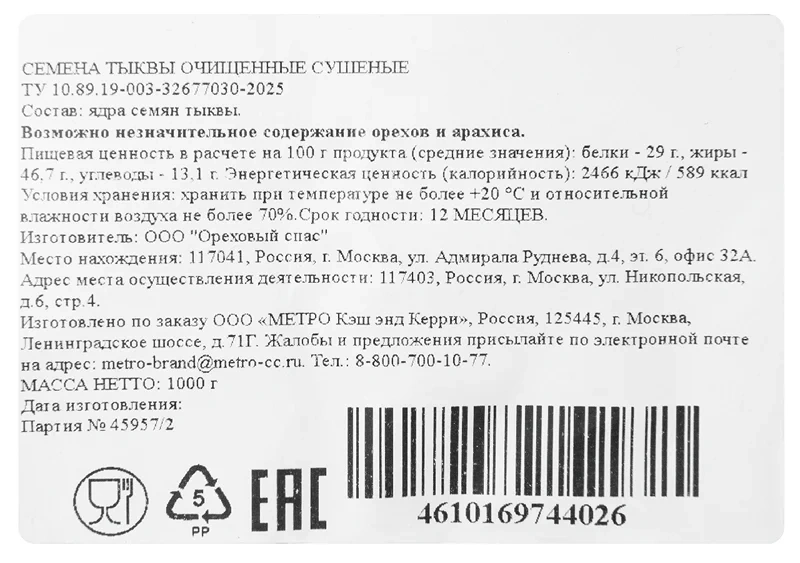 METRO Chef Семена тыквы сушеные очищенные, 1кг