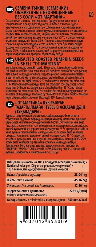 Семечки От Мартина тыквенные без соли неочищенные, 100г