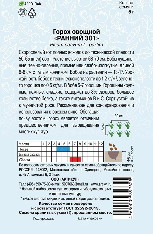 Семена Артикул Горох овощной Ранний, 10г