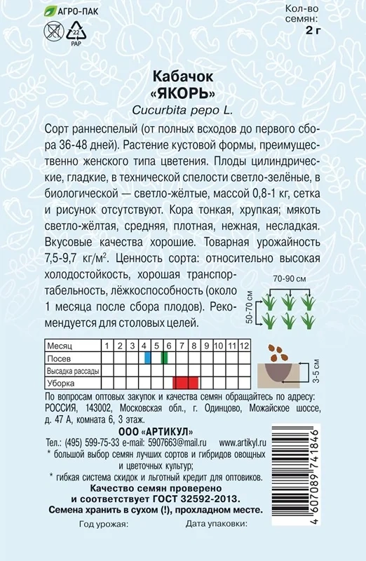 Семена Артикул Кабачок Якорь, 10г
