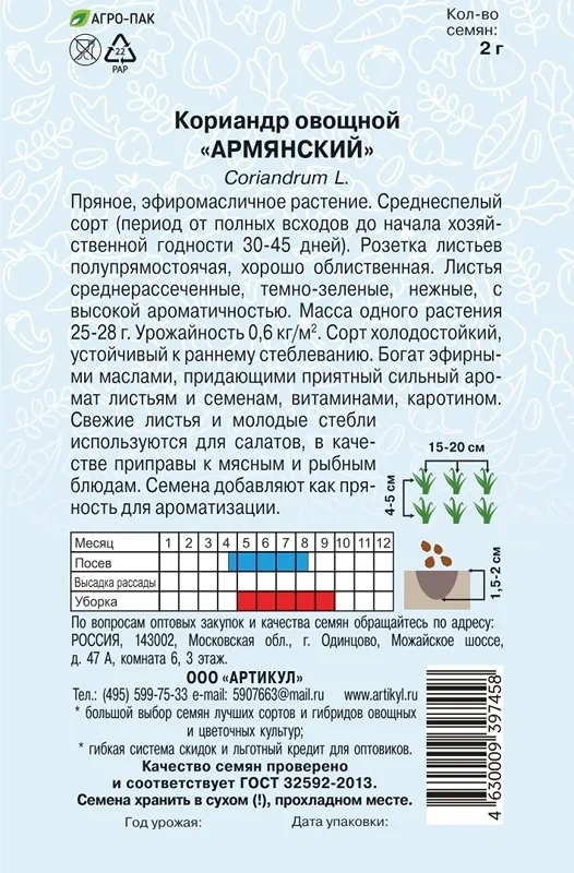 Пряное, эфиромасличное растение. Скороспелое (на зелень убирают на 30-35-й день после появления всходов, на семена - при побурении 2/3 семян (через 90-120 дней после всходов). Относительно холодостойкое. Масса растения 25-30 г. Урожайность 3 кг/м2. Молодые листья используют, как приправу к супам, мясным и рыбным блюдам, салатам и сыру. Семена используют в кулинарии, хлебопечении, при изготовлении колбас. Лучше удаётся на лёгких, высокоплодородных почвах. Посевы проводят с интервалом 2-3 недели, до середины лета.
