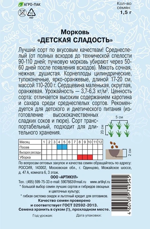 Лучший сорт по вкусовым качествам! Среднеспелый (от полных всходов до технической спелости 90-110 дней; пучковую морковь убирают через 50-60 дней после появления всходов). Мякоть сочная, нежная, душистая. Корнеплоды цилиндрические, тупоконечные, ярко-оранжевые, длиной 17-20 см, массой110-200 г. Сердцевина маленькая, округлая, оранжевая. Урожайность – 3,7-6,3 кг/м2. Ценность сорта: отличается высоким содержанием каротина и сахара среди среднеспелых сортов. Рекомендуется для детского и диетического питания (изготовление высококачественных сладких соков и пюре). Сорт транспортабельный, подходит для длительного хранения. + Содержит каротин, витамины В1, В2, Р. Морковный сок является лечебным средством.