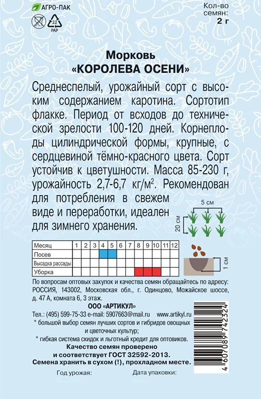 Среднеспелый (от всходов до технической спелости 100-120 дней), урожайный сорт с высоким содержанием каротина. Корнеплоды цилиндрической формы, крупные, с сердцевиной тёмно-красного цвета. Сорт устойчив к цветушности. Рекомендован для потребления в свежем виде и переработки, идеален для зимнего хранения. + Содержит каротин, витамины В1, В2, Р. Морковный сок является лечебным средством, полезен при диетическом питании.