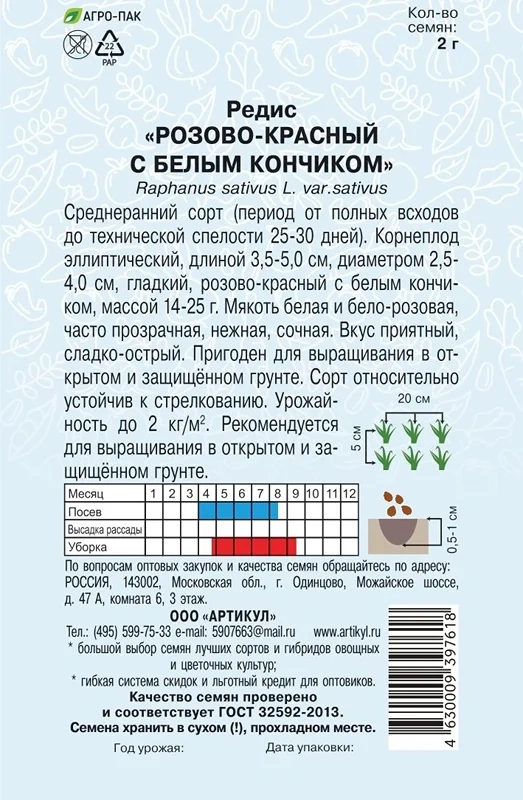 Семена Артикул Редис розово-красный с белым кончиком, 10г