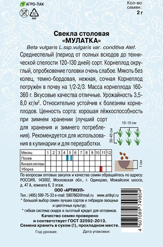 Среднеспелый (период от полных всходов до технической спелости 120-130 дней) сорт. Корнеплод округлый, опробковение головки очень слабое. Мякоть без колец, темно-бордовая, нежная, сочная Корнеплод погружён в почву на 1/2-2/3. Масса корнеплода 160- 360 г. Вкусовые качества отличные. Урожайность 3,5- 8,0 кг/м2. Относительно устойчив к болезням корнеплодов. Ценность сорта: хорошая лёжкоспособность при зимнем хранении (лучший сорт для хранения и зимнего потребления). Рекомендуется для использования в кулинарии и для переработки. В корнеплодах и листьях имеются витамины B1, B2, РР. Нормализует артериальное давление и предупреждает гипертонию, снижает содержание холестерина в крови.